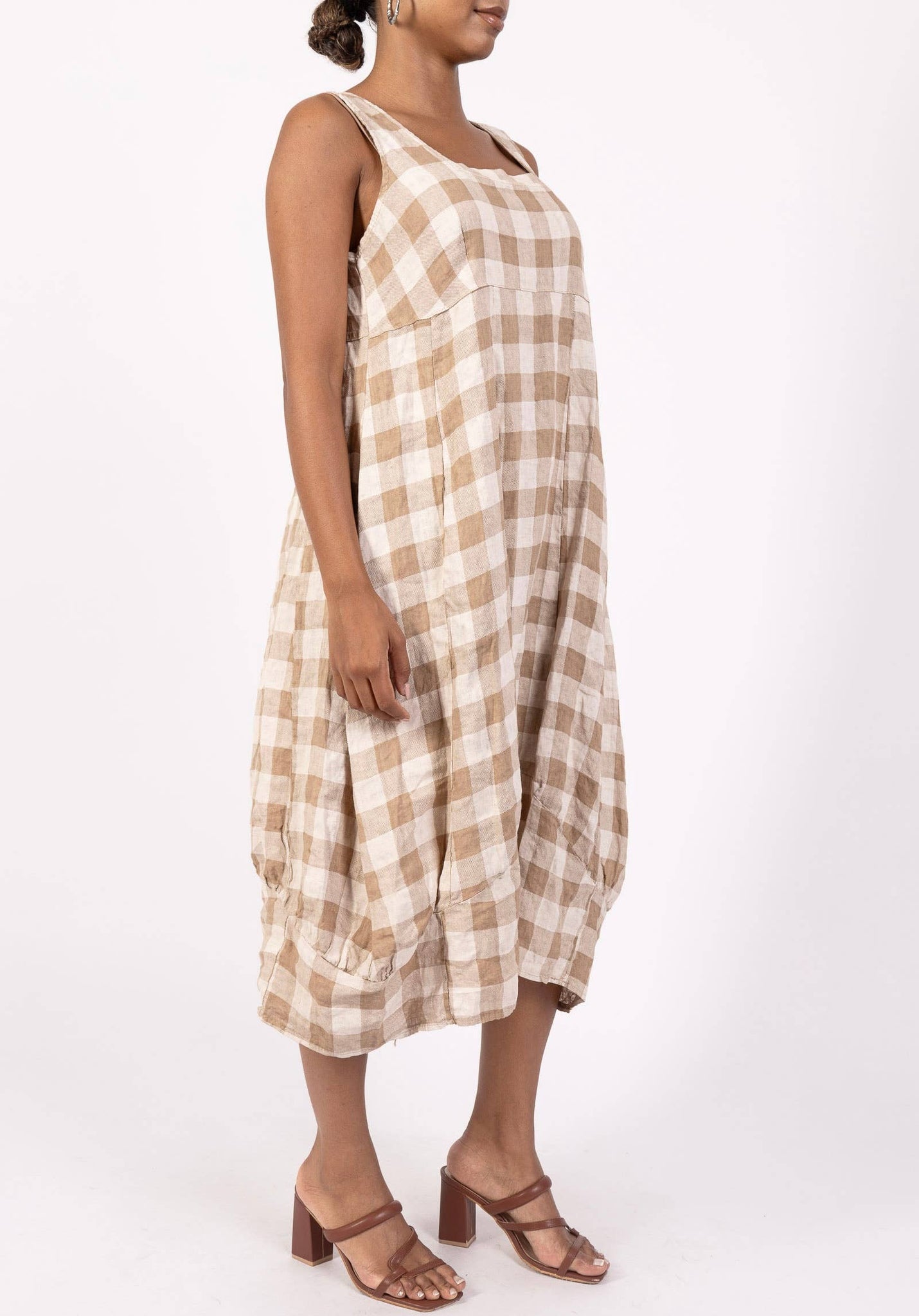 Colette Italian Made Linen Sleeveless Gingham Maxi Dress ~ Khaki