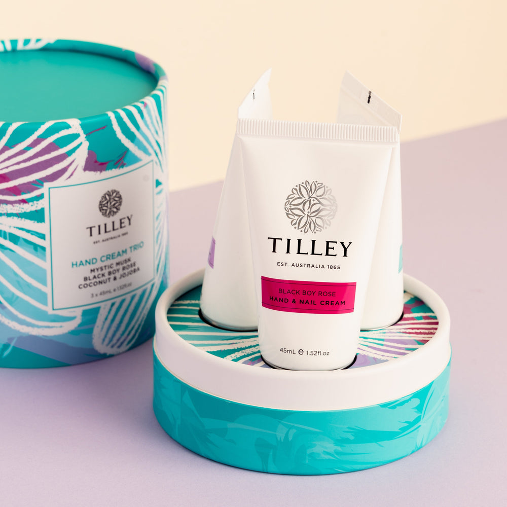 3x 45mL Hand & Nail Cream includes Mystic Musk, Black Boy Rose + Coconut & Jojoba, favourites from our Tilley Classic White core range!